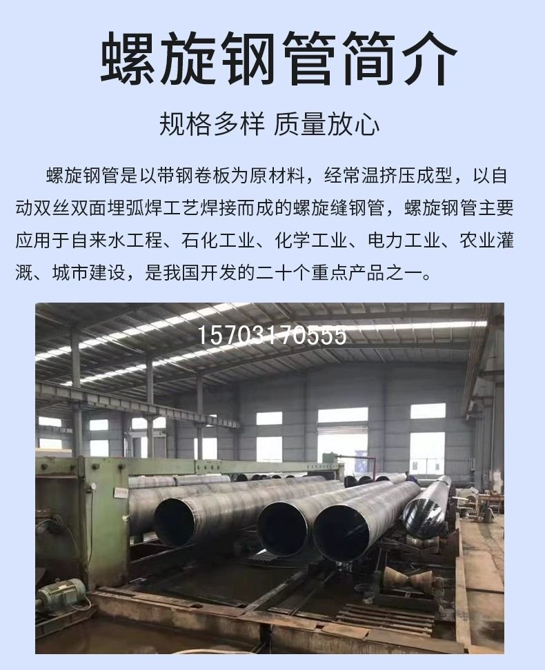 此外,大口徑防腐螺旋鋼管在多個領域有著廣泛的應用,如石油、化工、天然氣、城市供水、污水處理等行業。它具有良好的防腐性能和高強度特點,可以有效地防止腐蝕和氧化,保證管道的穩定、長期的運行。同時,其運輸和安裝也非常方便,可以在短時間內完成管道的鋪設,提高了工作效率。